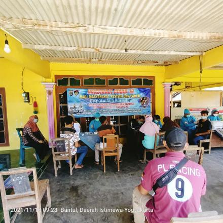 PoncoWarta - Warga masyaraakt pesisir di wilayah Kalurahan Poncosari mengikuti kegiatan vaksinasi Covid-19 yang dilaksnaakan oleh Dit Polairud DIY. Kegiatan vaksinasi dilaksanakan di rumah dukuh Kuwaru Poncosari Srandakan Bantul pada hari kamis (18/11/2021) pukul 09.00 WIB.