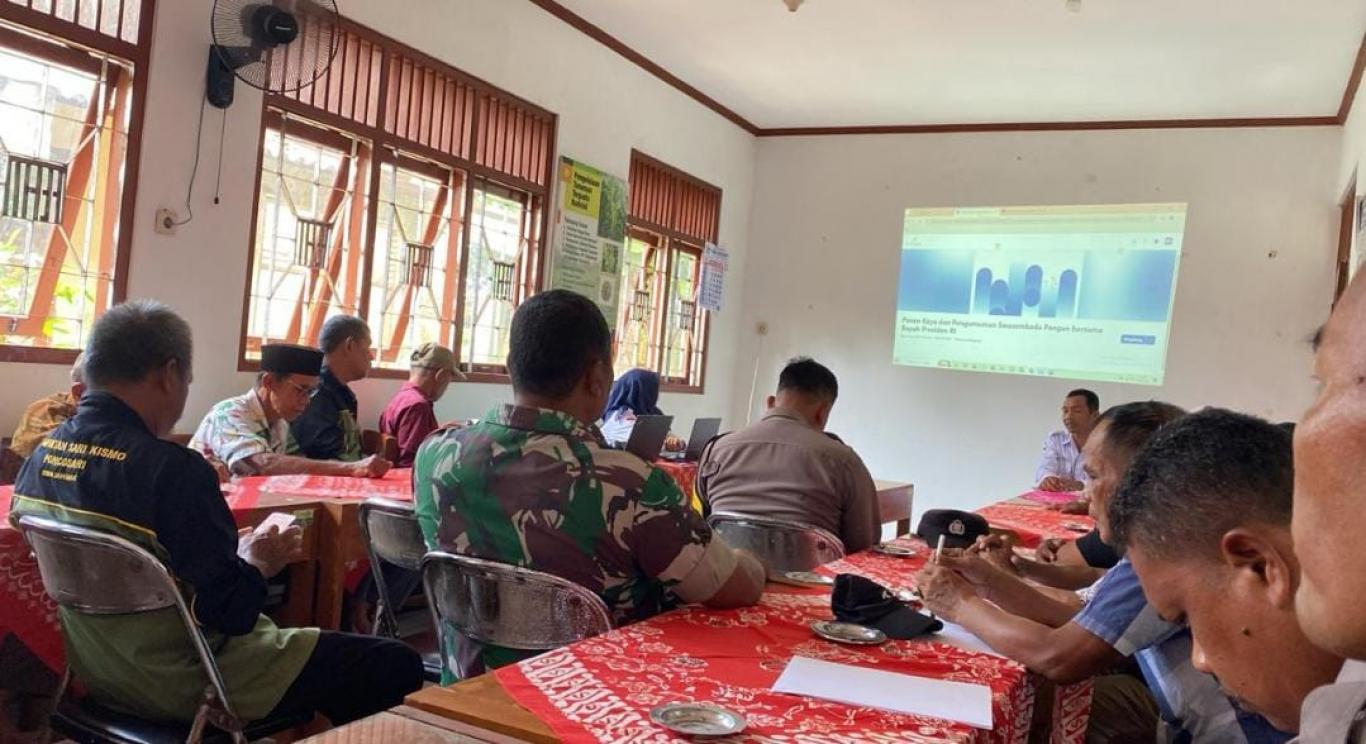 PoncoWarta - Bertempat di Balai Pertemuan Kantor BPP Kapanewon Srandakan, dilaksanakan giat mengikuti kegiatan Zoom Meeting bersama Kementerian Pertanian Republik Indonesia dengan agenda utama “Panen Raya dan Pengumuman Swasembada Pangan”. Dilaksanakan pada hari Rabu (7/1/2026) kegiatan zoom di Balai Pertemuan Kantor BPP Kapanewon Srandakan ini dihadiri oleh Kepala BPP Srandakan, Ulu-Ulu Poncosari, Babinsa dan Bhabinkamtibmas serta Gabungan Kelompok Tani (Gapoktan) Sarikismo Kalurahan Poncosari.